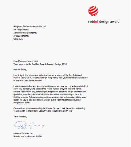 我很榮幸地通知您成為紅點獎——2016年產品設計獎的獲獎者?!?在賀信中,彼得·扎克博士也介紹,一共有來自57個國家的5214件產品參與角逐今年的紅點產品設計獎,獲獎作品經過了來自設計與傳媒領域41名專業評委的嚴格評審。