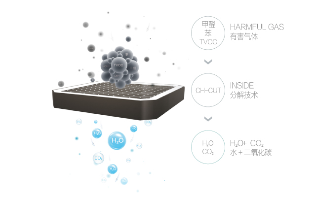 面對家庭除醛難題,無需煩惱,CH-CUT除醛“黑科技”來了!UCHEER友好擁有的CH-CUT甲醛催化分解專利技術(shù),能夠?qū)諝馕廴局刑囟怏w(甲醛、苯類等TVOC)進行催化分解。CH-CUT的凈化原理是利用納米級功能性催化劑材料的催化作用,在室溫下對甲醛、苯類等TVOC有機污染物進行高效分解。在凈化過程中,俗稱“碳氫剪刀”的CH-CUT技術(shù)促使有機物中的碳氫鏈斷裂,使空氣中的氧與斷裂的碳氫鏈發(fā)生化學(xué)反應(yīng),生成二氧化碳和水。